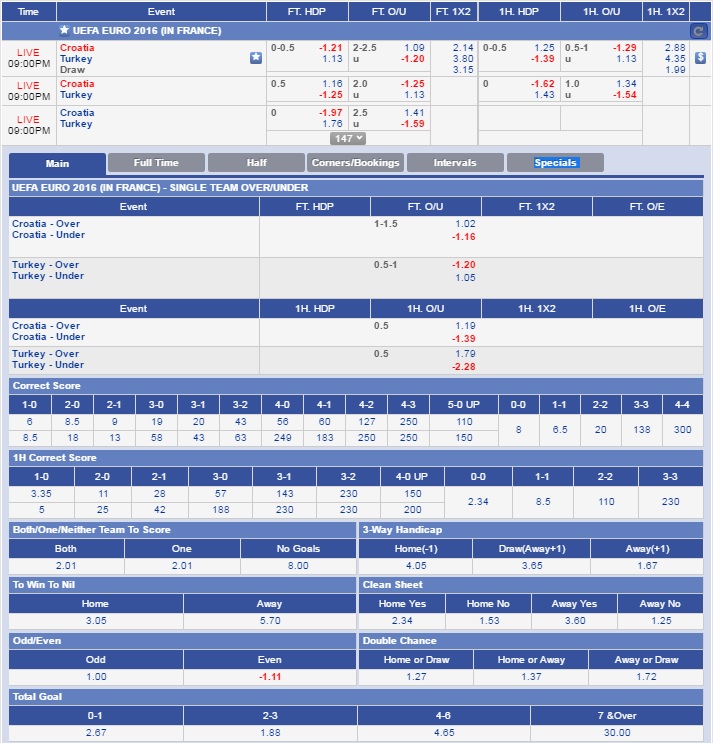 Untuk HDP (handicap), O/U (Over/Under) & O/E (Genap/Ganjil), terdapat angka (kei) dengan warna hitam ataupun merah.